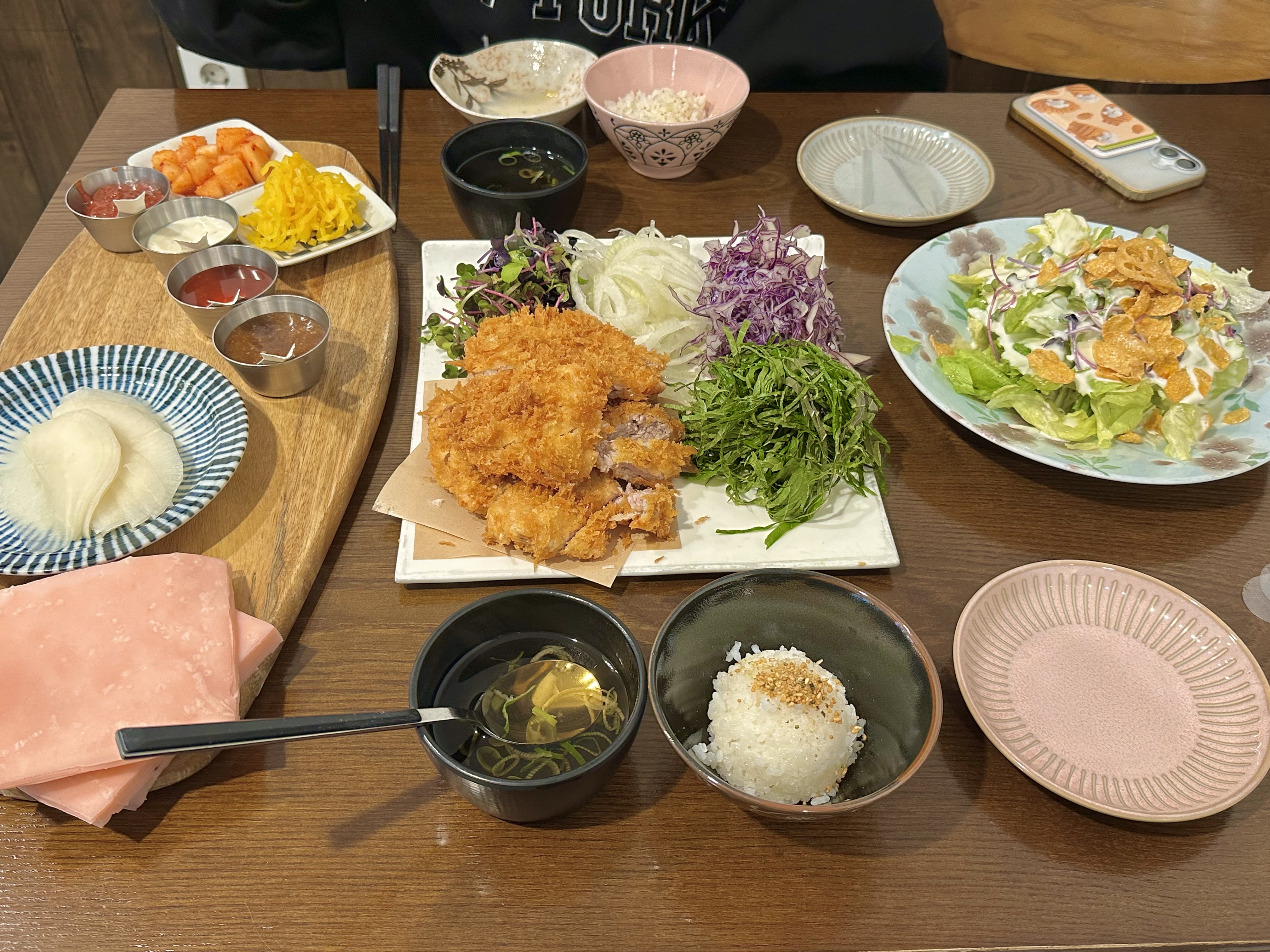 기본 돈까스도 맛있지만 여기서는 마싯내 돈까스 2인 세트를 먹어봐야 한다. 싸먹는 돈까스라서 떡쌈, 야채, 쌈무와 소스 네 가지가 함께 나오는데, 돈까스라기보다는 고기를 쌈 싸먹는 느낌이라 훨씬 만족스럽다. 돈까스도 두툼하게 나오고 밥과 국물까지 함께 제공돼서 배부르게 먹다 보면 조금 남기고 올 때도 있다. 기본으로 주는 샐러드도 신선하고 맛있다.