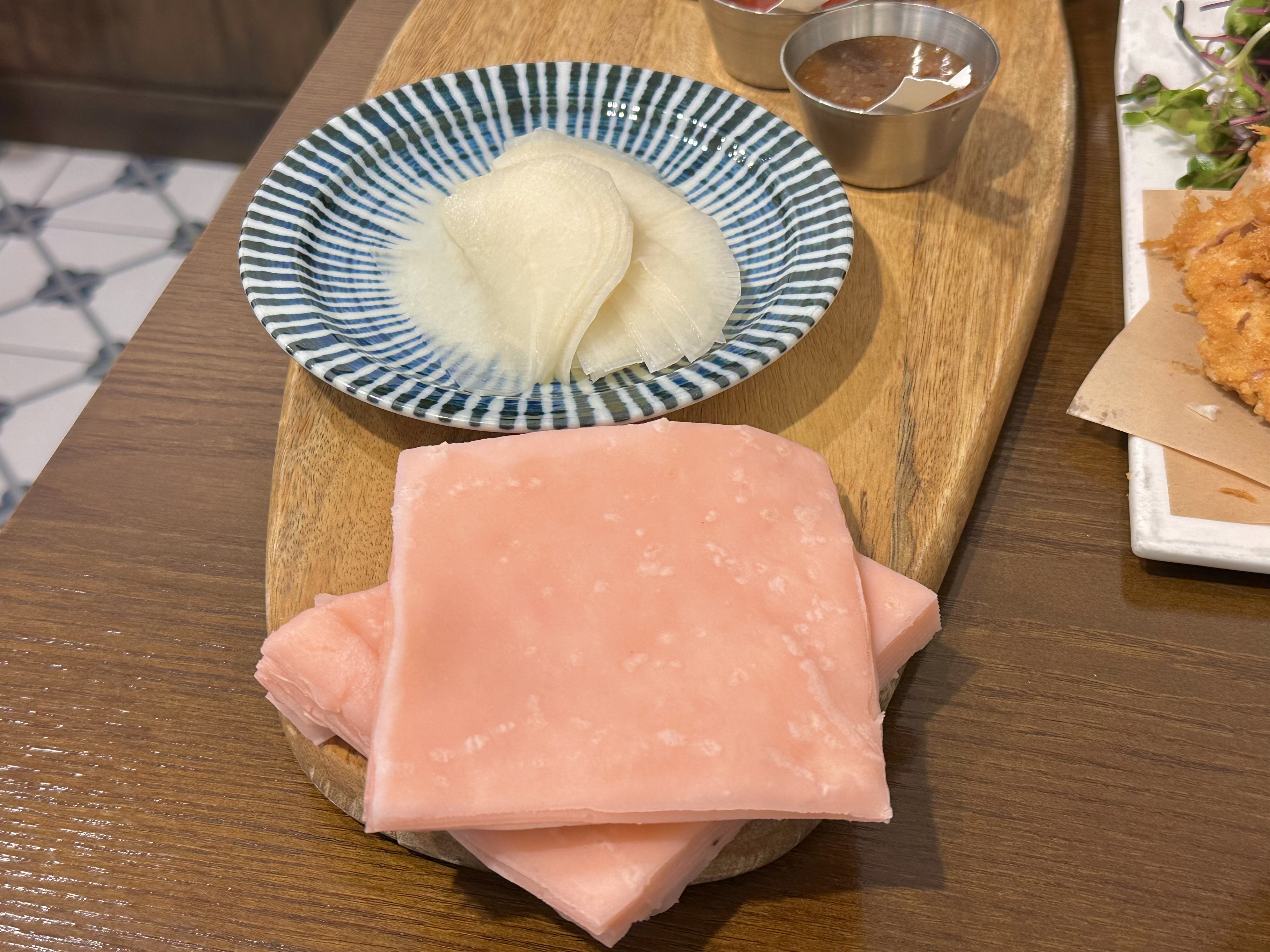 돈까스 두께가 꽤 두툼해서 씹는 맛이 좋다. 떡쌈 위에 돈까스를 올리고 야채와 소스를 곁들여 먹으면 단순히 돈까스를 먹는 것보다 훨씬 풍성한 조합이 된다.